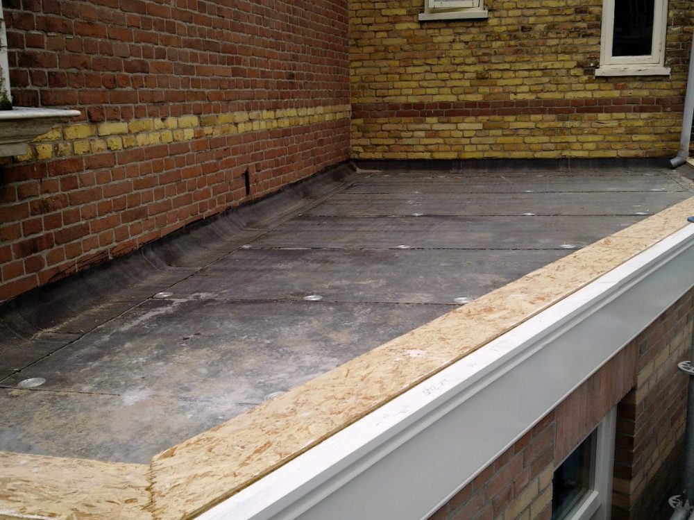 De reeds door de aannemer aangebrachte onderlaag is door ons op de juiste wijze mechanisch door middel van drukverdeelplaten aan het houten dakbeschot bevestigd. Hierop is een bitumen dakbedekking met leislag aangebracht.