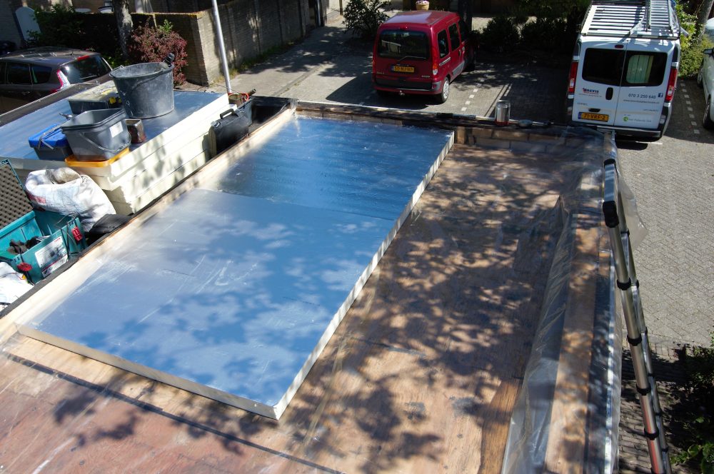 We hebben eerst de oude dakbedekking van de keukenuitbouw verwijderd. Daarna hebben we een dampremmende folie aangebracht met hierop een PIR afschot isolatie om de afwatering te verbeteren. Vervolgens hebben we een EPDM bedekking verlijmd op de nieuw aangebrachte PIR-isolatie.